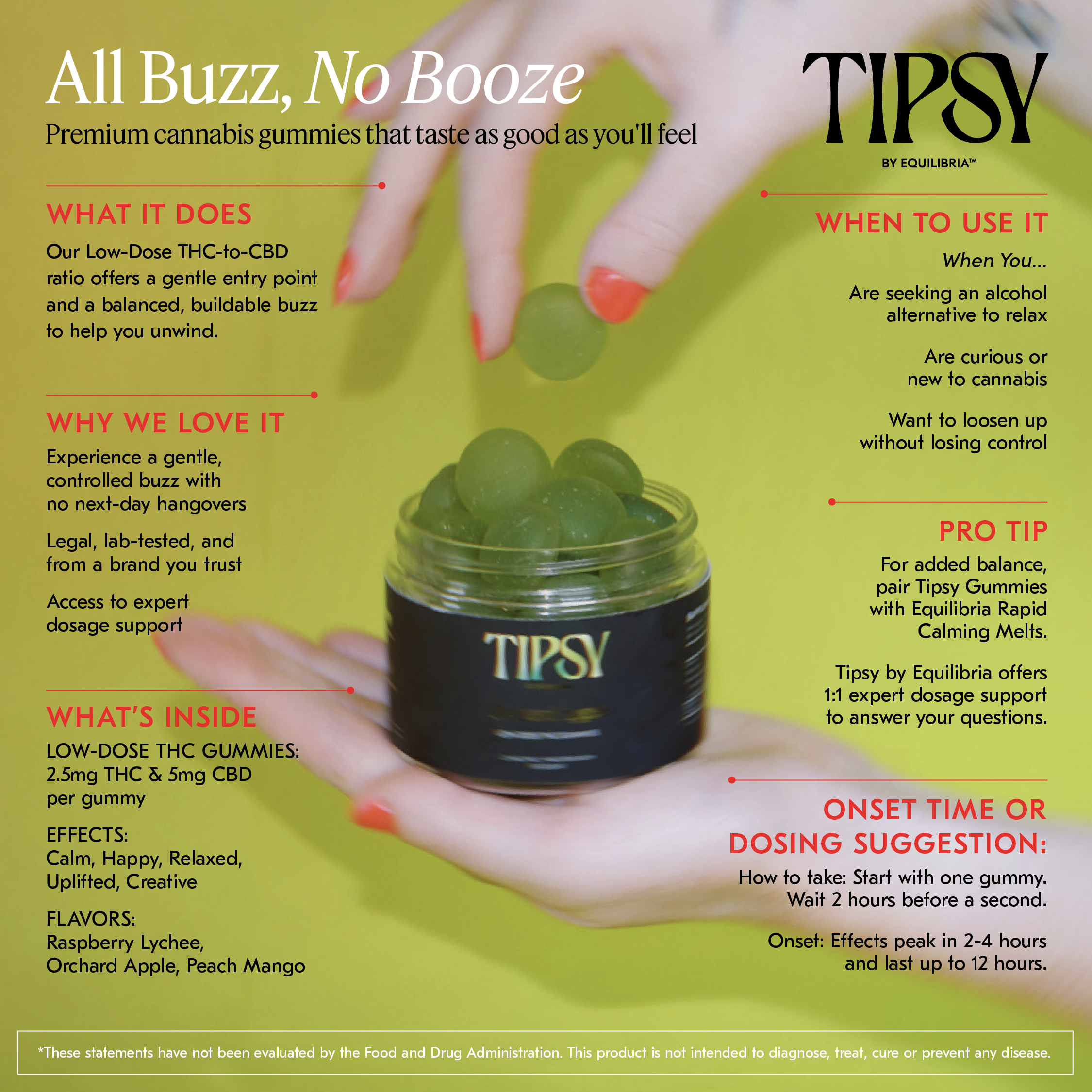 Enjoy a better way to unwind with Tipsy Low Dose THC Gummies, designed to elevate your mood and deliver the perfect, controlled chill.
