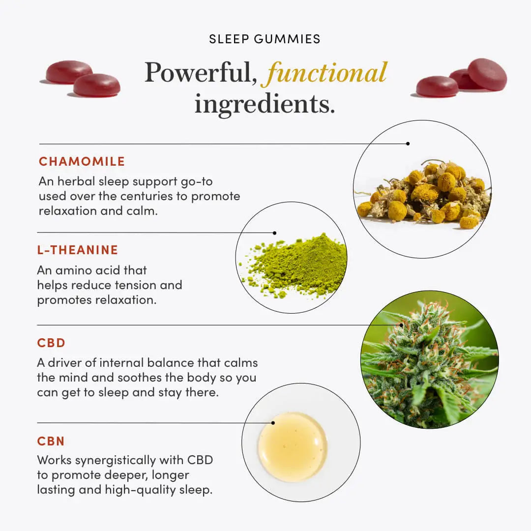 Organic Tapioca Syrup, Organic Cane Sugar, MCT Oil (derived from coconut), Organic Full-Spectrum Hemp Flower Concentrate, Cannabinol (CBN), Organic Chamomile, L-theanine, Pectin, Citric Acid, Sodium Citrate, Natural Flavoring, Fruit and Vegetable Juice (for color).