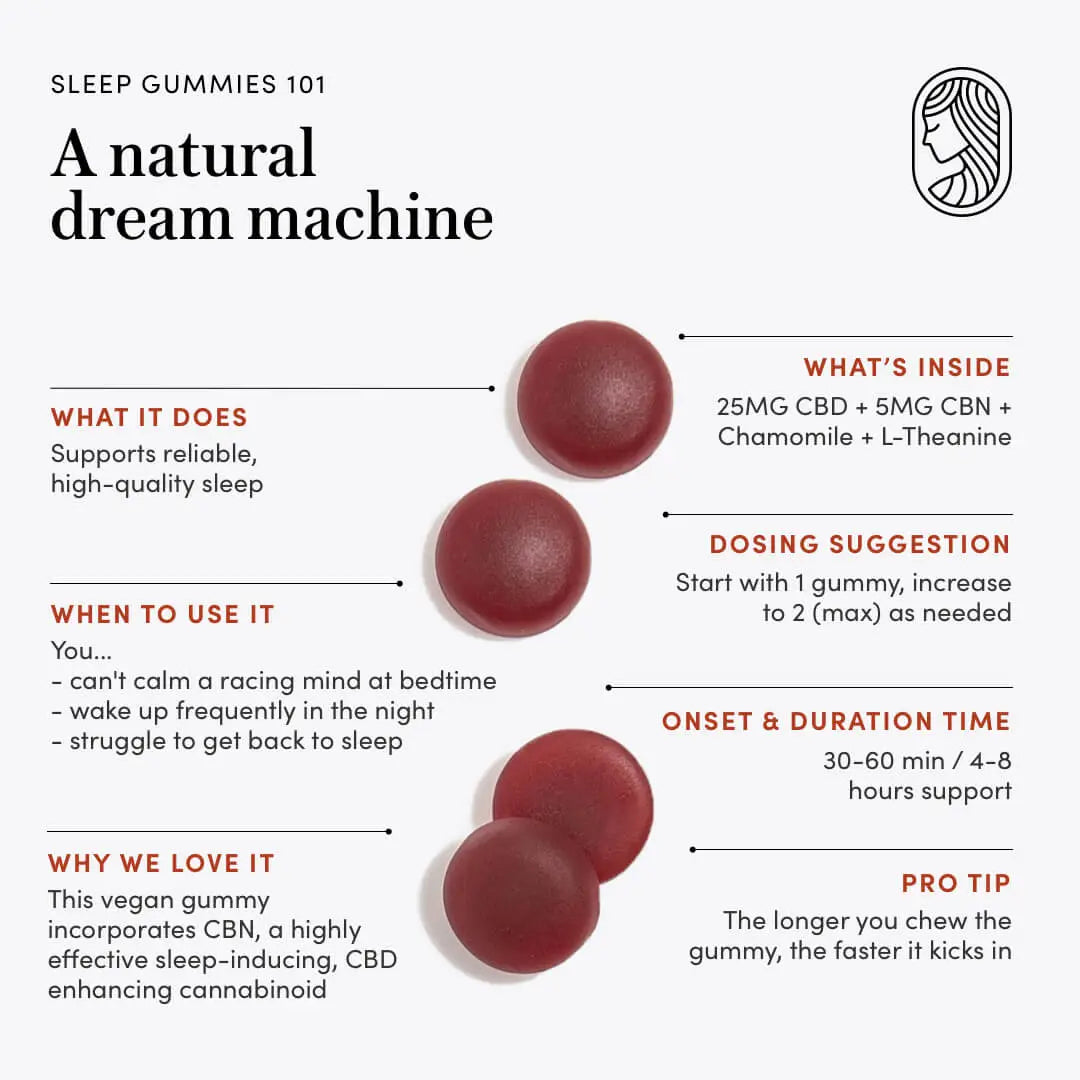 Our Nightly Sleep Gummies are formulated with extra-strength CBD, along with CBN and a botanical blend of Chamomile and L-theanine. Boasting rich notes of Bordeaux Cherry, the Sleep Gummies are a delicious way to maximize calm and help balance a healthy sleep-wake cycle for a luxurious night’s sleep.*